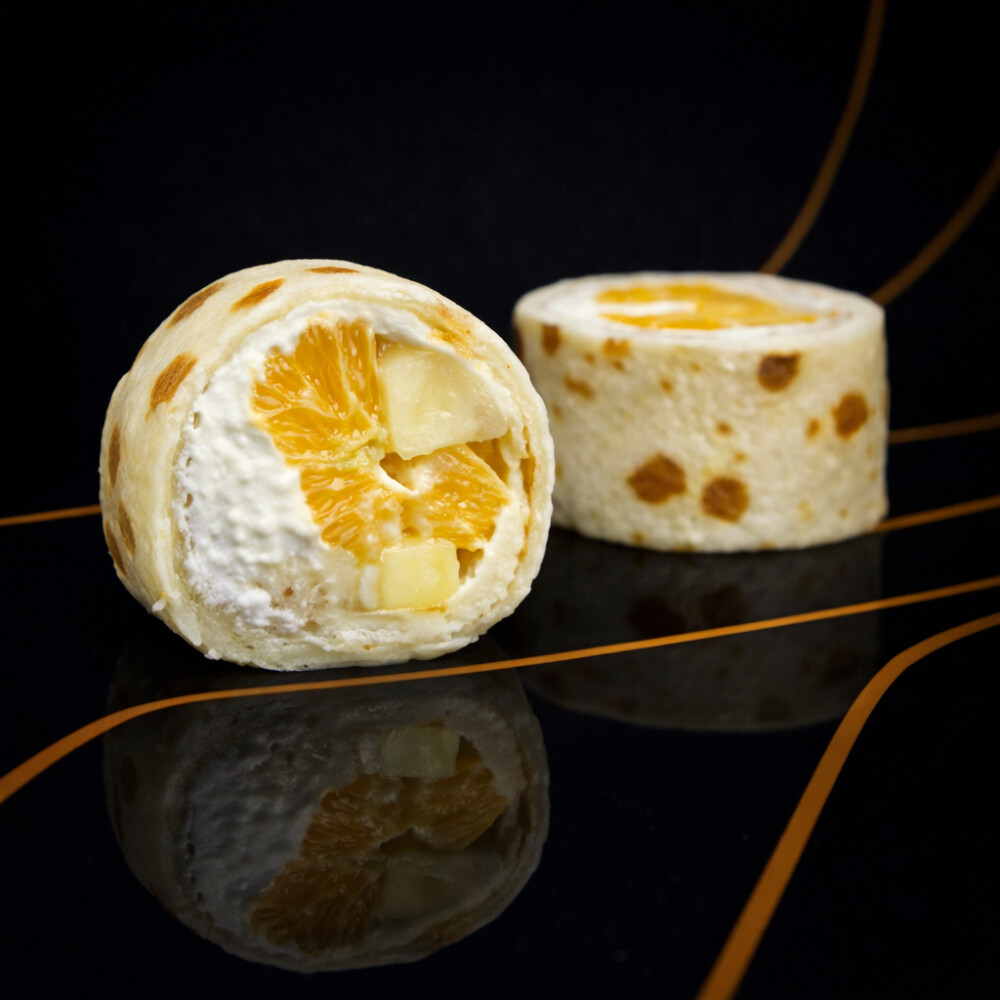 Сладкий блинчик с ванилью и сахаром, сливочный сыр с ванилью и сахарной пудрой, банан, апельсин