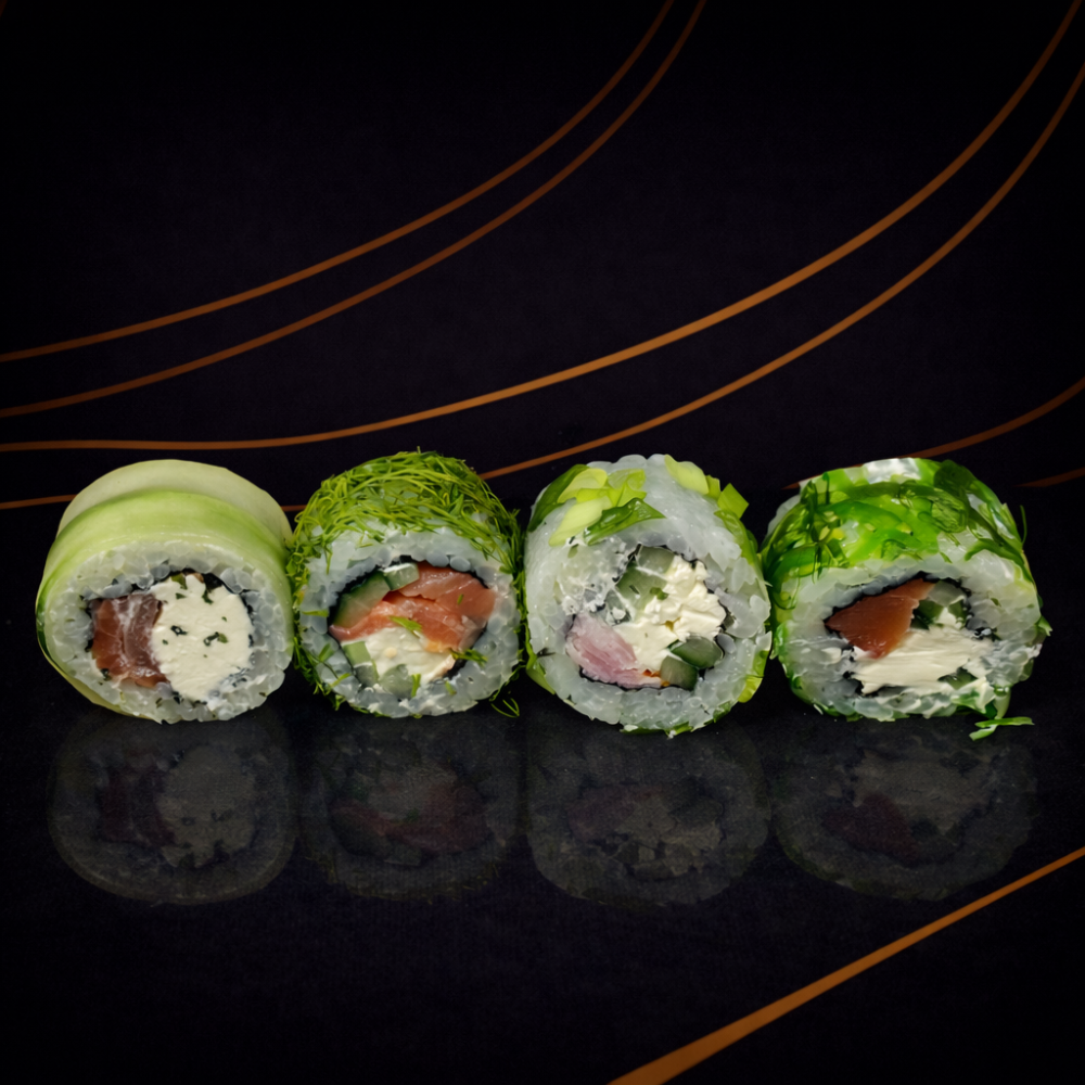 Филадельфия "Грин", Чука ролл, Ролл с беконом в луке, Ролл с копченым лососем в укропе
