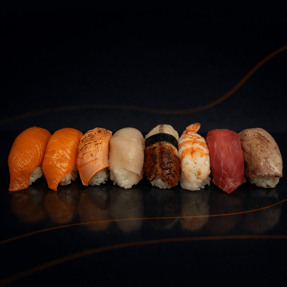 Нигири: с лососем, с копченым лососем, с креветкой, с тунцом, с угрем, с окунем, с опаленным лососем, с опаленным тунцом, васаби, имбирь, соус "Соевый"