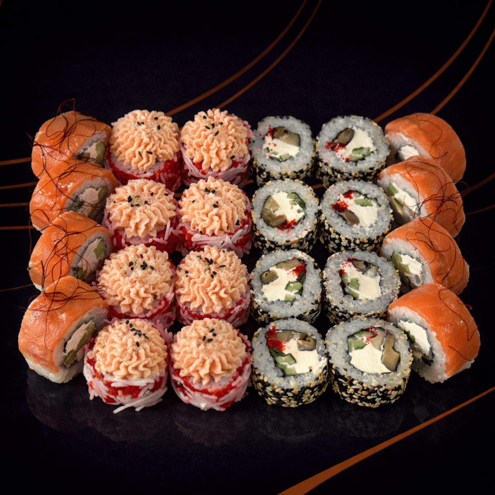 Сочетание лосося, креветки и снежного краба с деликатной сливочной мягкостью и икорными акцентами. Многослойный вкус раскрывается постепенно, сохраняя чистоту и глубину.