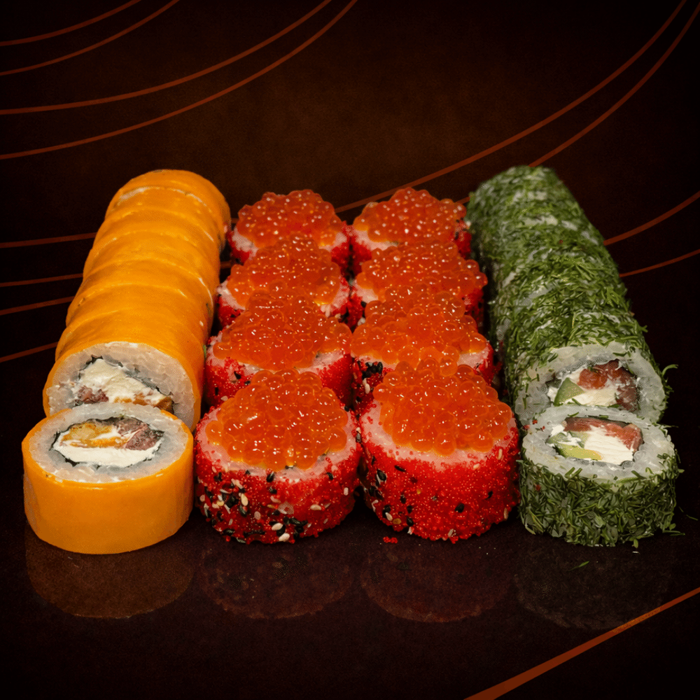 Благородное сочетание лосося, икры и хрустящей креветки в темпуре с тонким сливочным балансом. Чистый вкус и уверенная текстура в каждом элементе. Классический премиум в современной подаче.