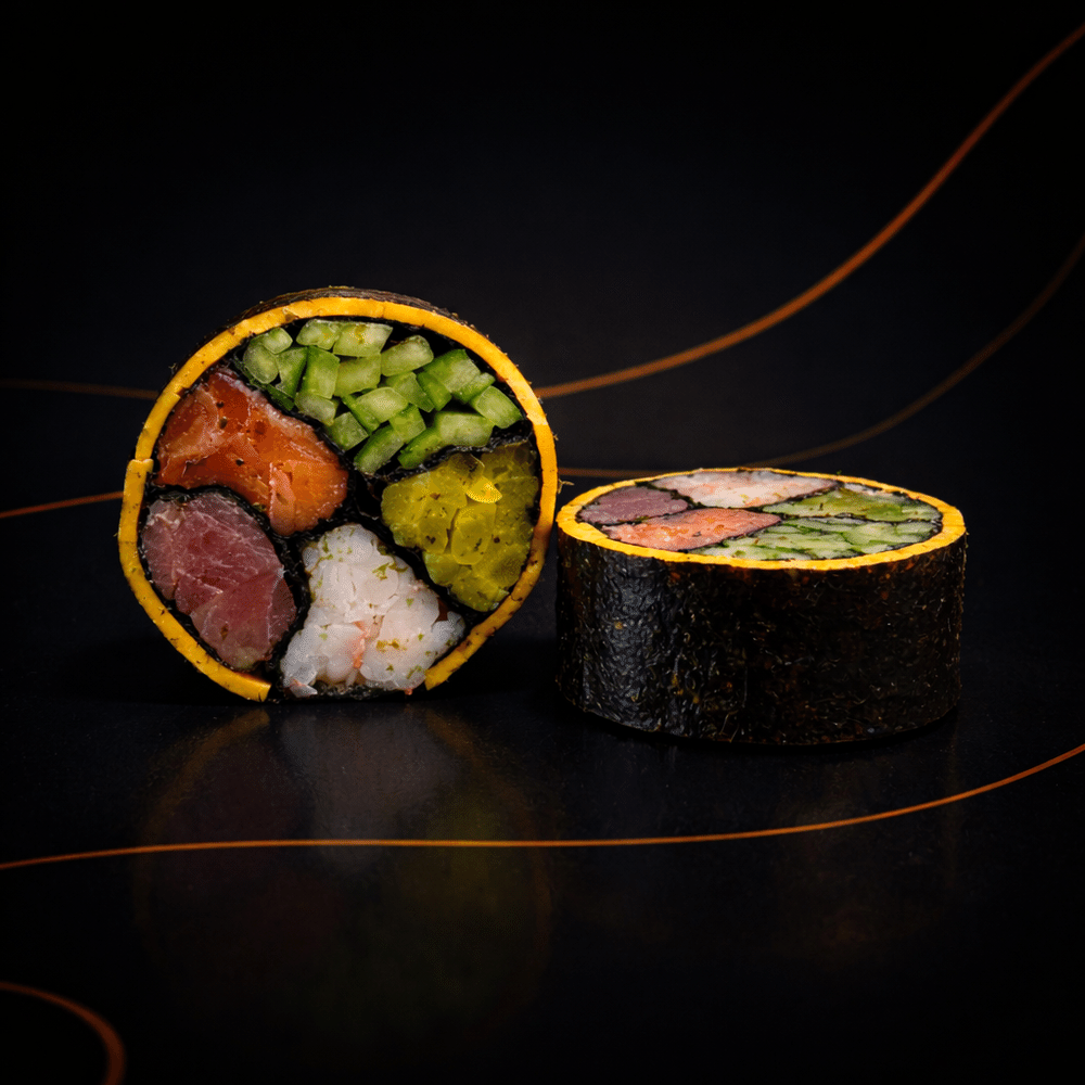 Лосось, тунец, креветка, такуан, огурец, сыр "Чеддер"