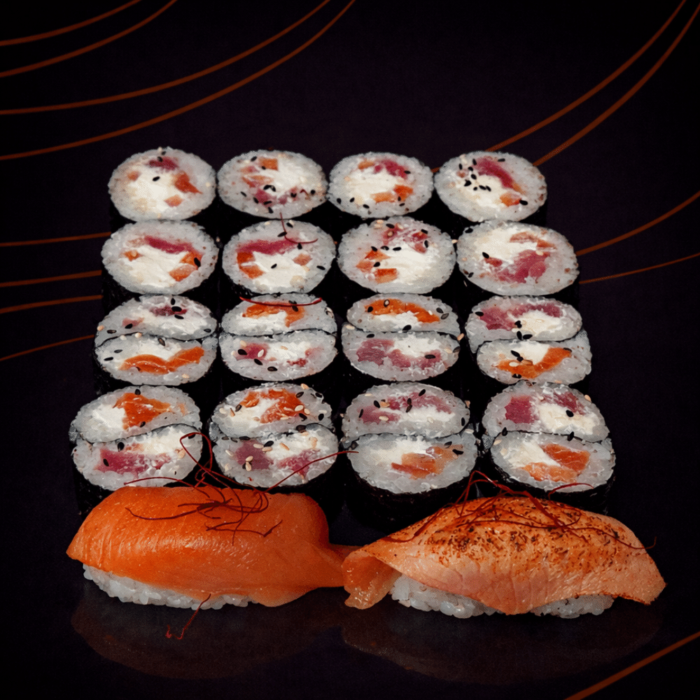 Сет объединяет благородного лосося и насыщенного тунца в гармоничной композиции роллов и нигири.