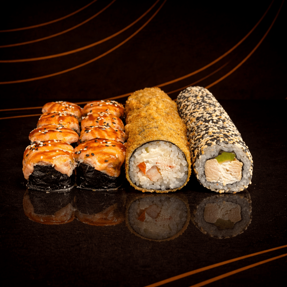Настоящий микс разных видов роллов. В составе хрустящая темпура с креветками и крабом, нежный чикен ролл и запеченный ролл с лососем